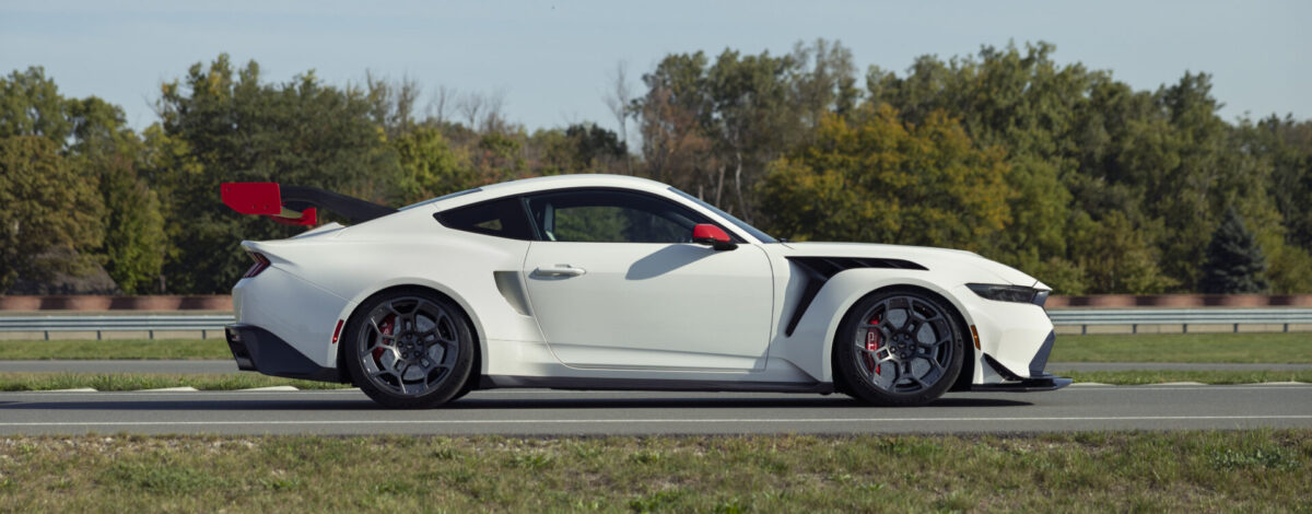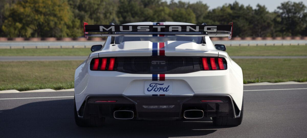 Spirit of America zyskał dzięki temu białe malowanie, nazwane Performance White. Przez całą długość nadwozia biegą również 2 pasy, czerwony Race Red i niebieski czyli Lightning Blue. Wszystkie widoczne czarne elementy zostały wykonanie z włókna węglowego. Włókno węglowe jest podstawowym elementem elementów aerodynamicznych czyli przedniego splittera, tylnego dyfuzora oraz spojlera. Spojler jest elementem wieńczącym nadwozie Mustanga. Od jego spodu znajduje się napis MUSTANG. Jak twierdzi ford, to zabieg który ma dać pewność co nas właśnie wyprzedziło.
