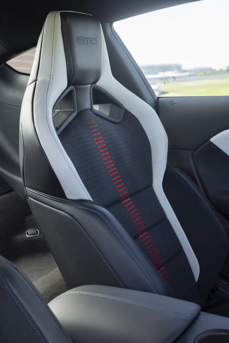 Pakiet „Mustang GTD Performance”auto otrzymuje w standardzie, tak jak zaciski Race Red. Kokpit jest całkowicie przeszkolony. Wnętrze w porównaniu do nadwozia jest całkowicie czarne w odcieniu Black Onyx. Siedzenia zaś grają tu główną role, skórzane z wstawkami Dinamica. Na pierwszym planie wyróżnia się gradient pośrodku w odcieniu Race Red z wykończeniem Re-Entry White i przeszyciami w Victory Blue. Odcień Victory Blue pojawia się również w całej kabinie jako element kontrastowy dla czerni.