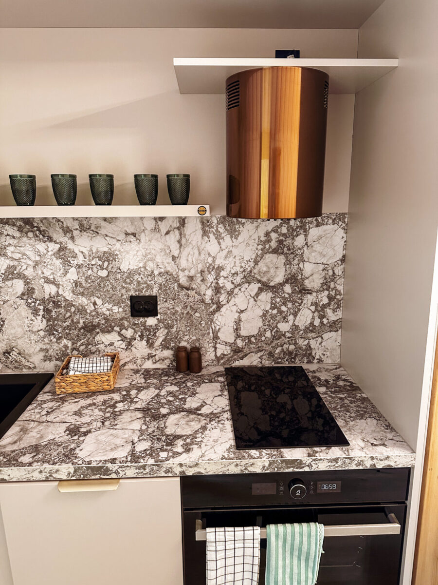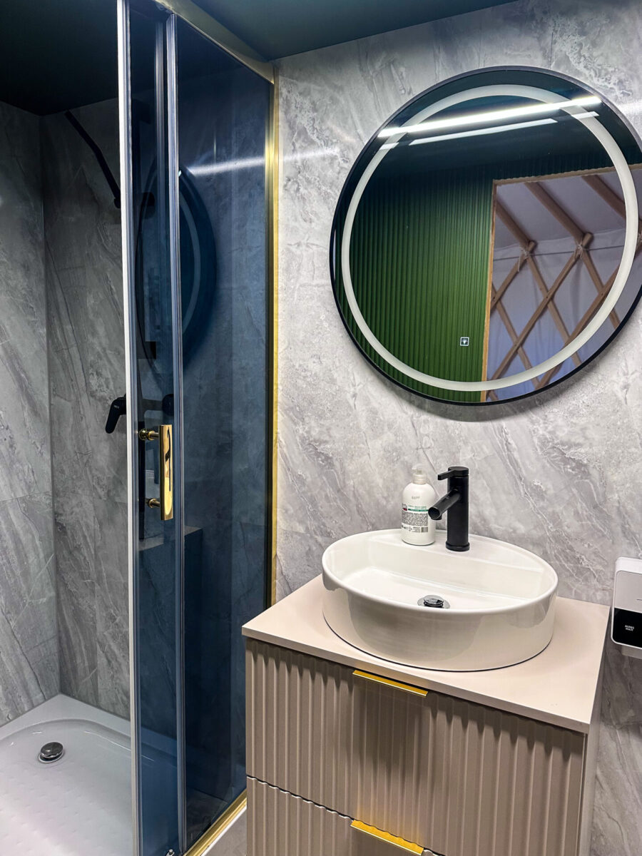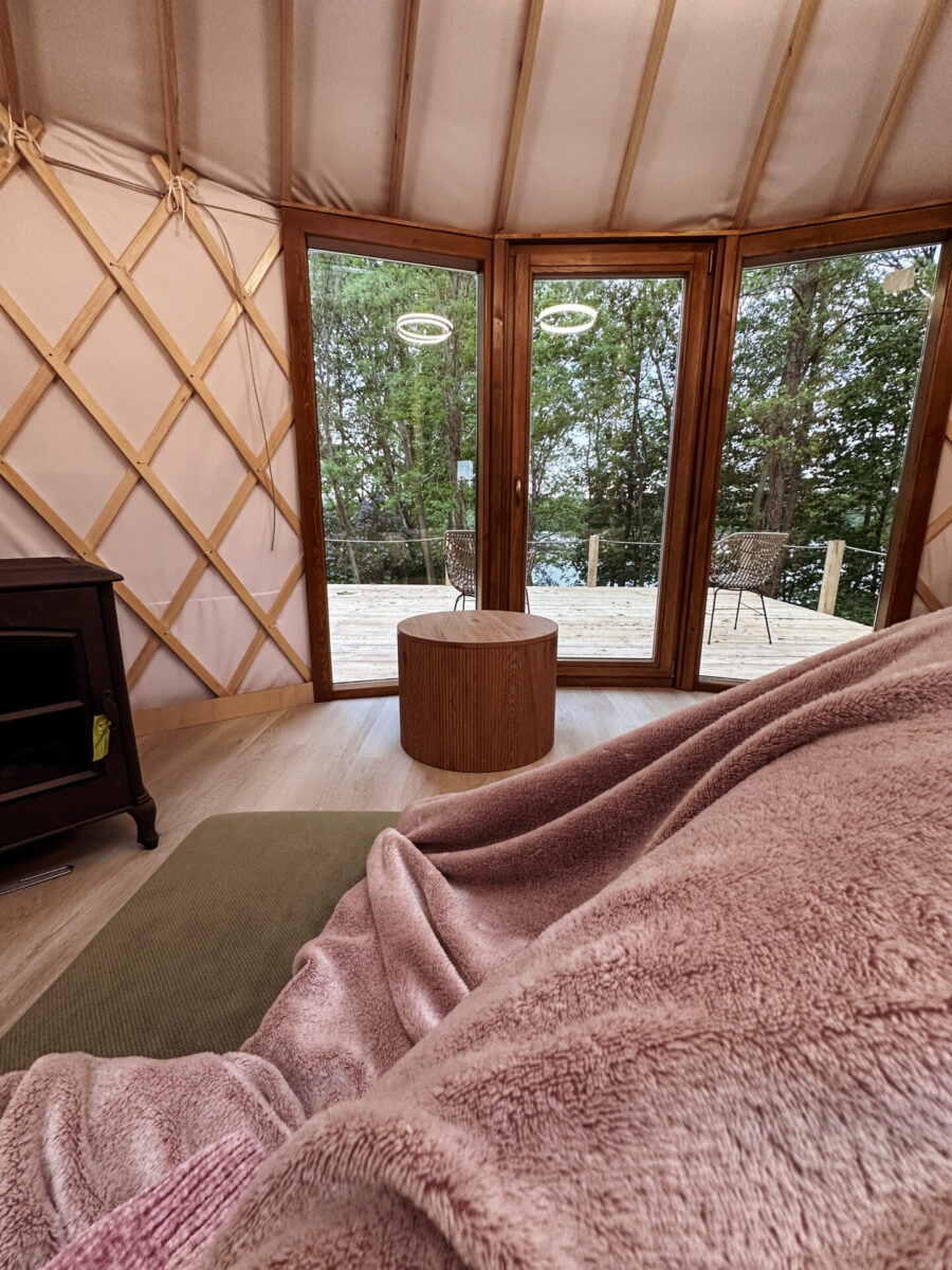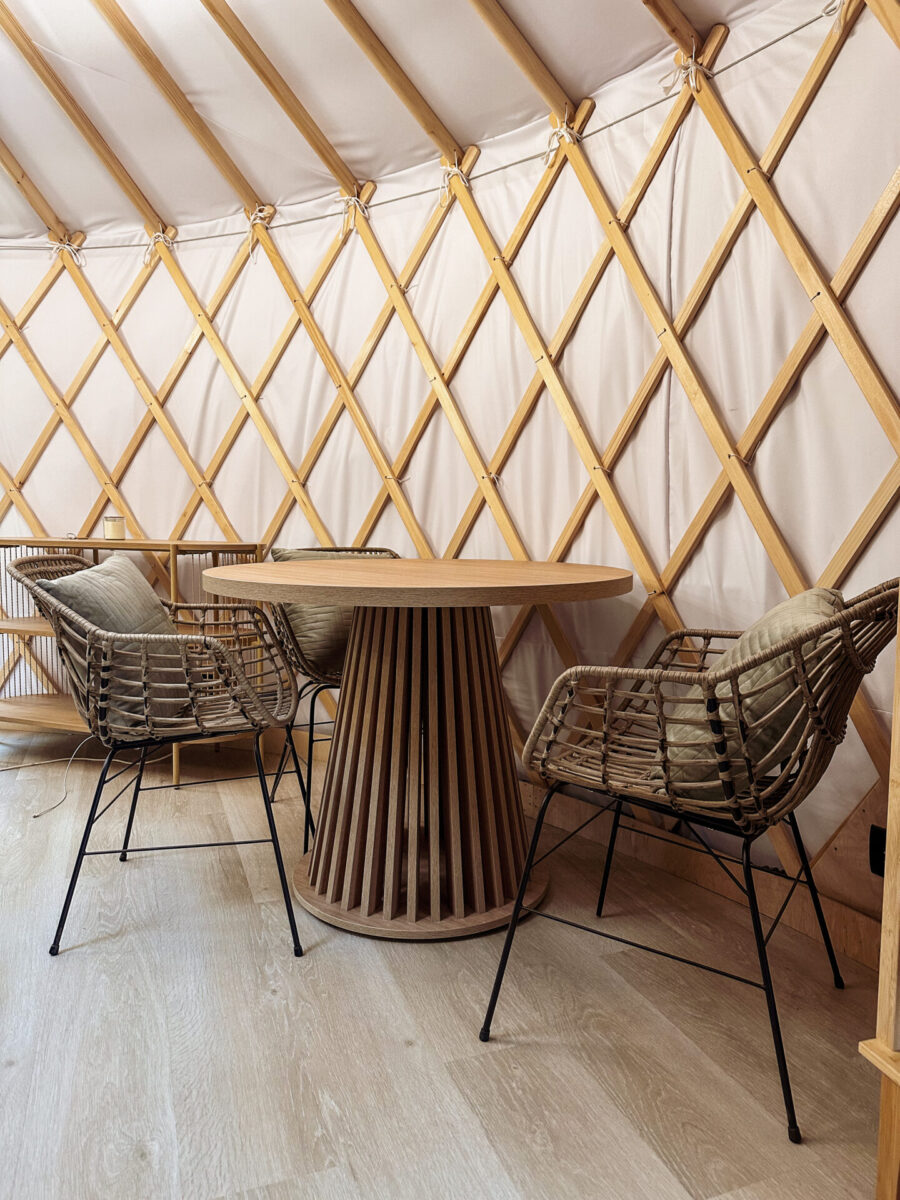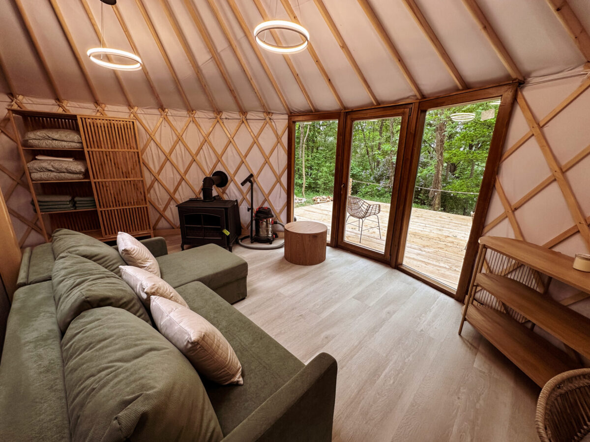 I nie myliłam się. To, co zobaczyłam na własne oczy, przerosło moje oczekiwania. Nie sądziłam, że wnętrze jurty może być aż tak nowoczesne i jednocześnie klimatyczne. Drewniane belki, stylowe meble, w pełni wyposażona kuchnia, sofa ustawiona tak, by z niej rozpościerał się widok na taras i jezioro, kominek… A do tego łazienka, której nie powstydziłby się porządny hotel.