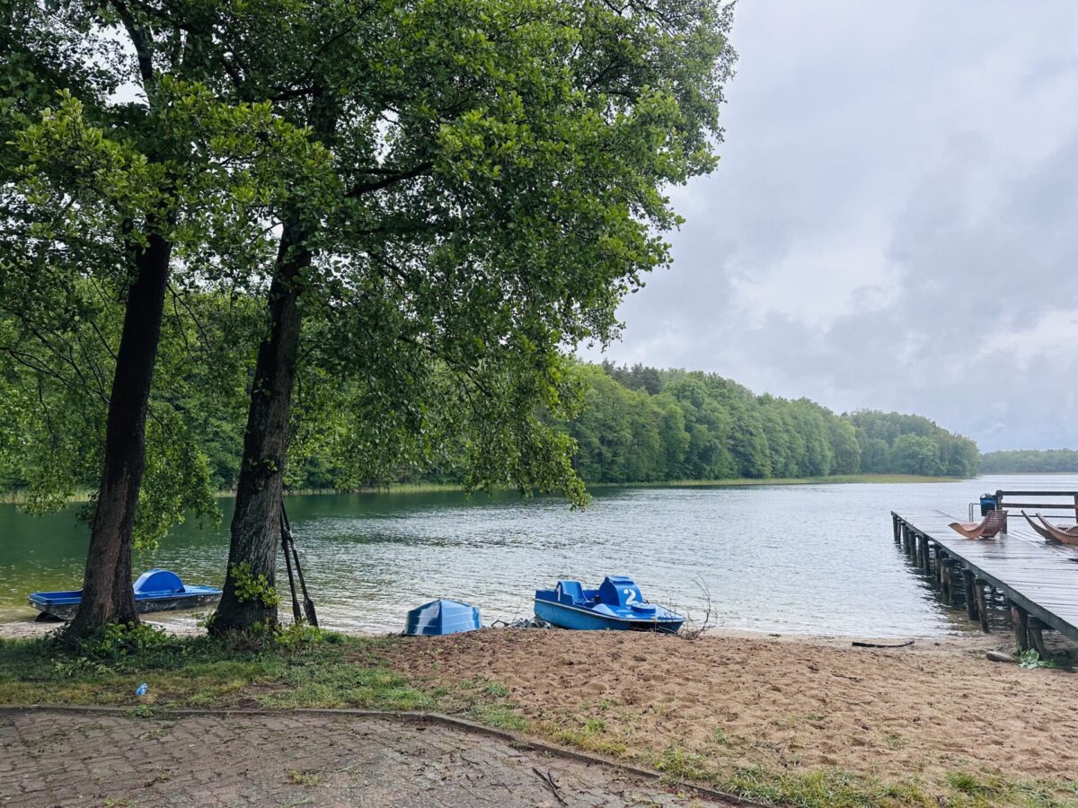Pomyśl o tych najfajniejszych koloniach nad jeziorem – domki w lesie, plaża, miejsce na ognisko, boisko do siatkówki… A teraz dorzuć do tego restaurację na terenie kompleksu, drewniany pomost wychodzący w jezioro, saunę z widokiem na wodę i – wisienka na torcie – jurty, w których można się zaszyć i zapomnieć o całym świecie.