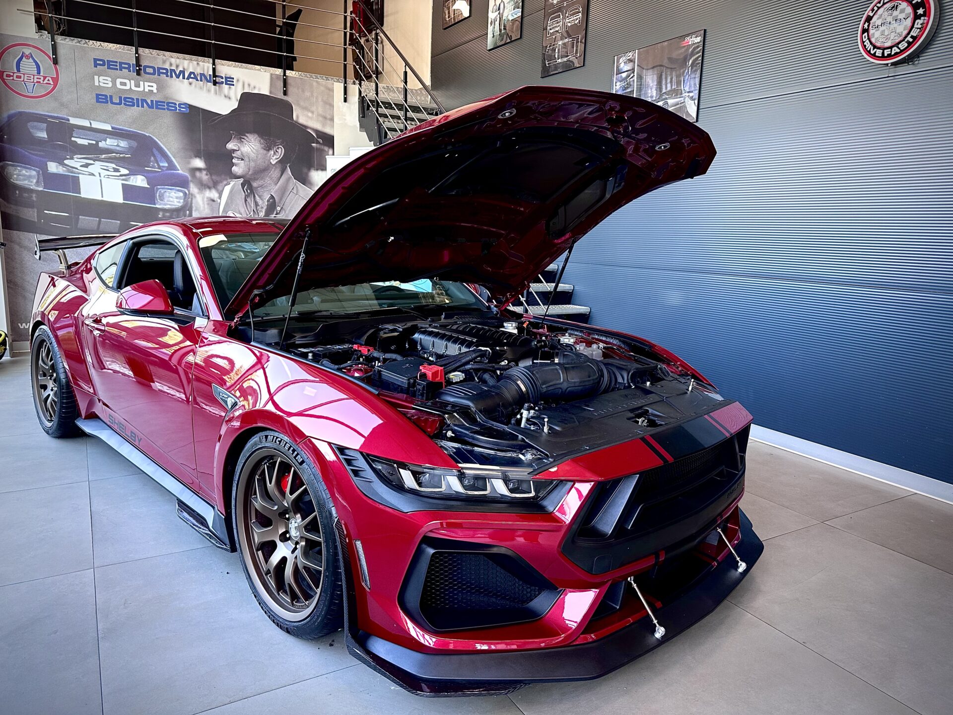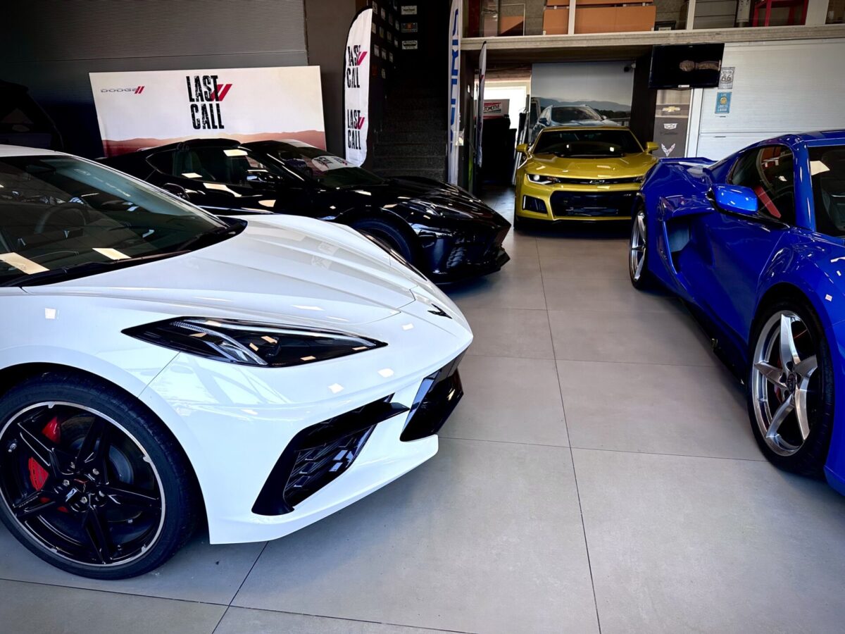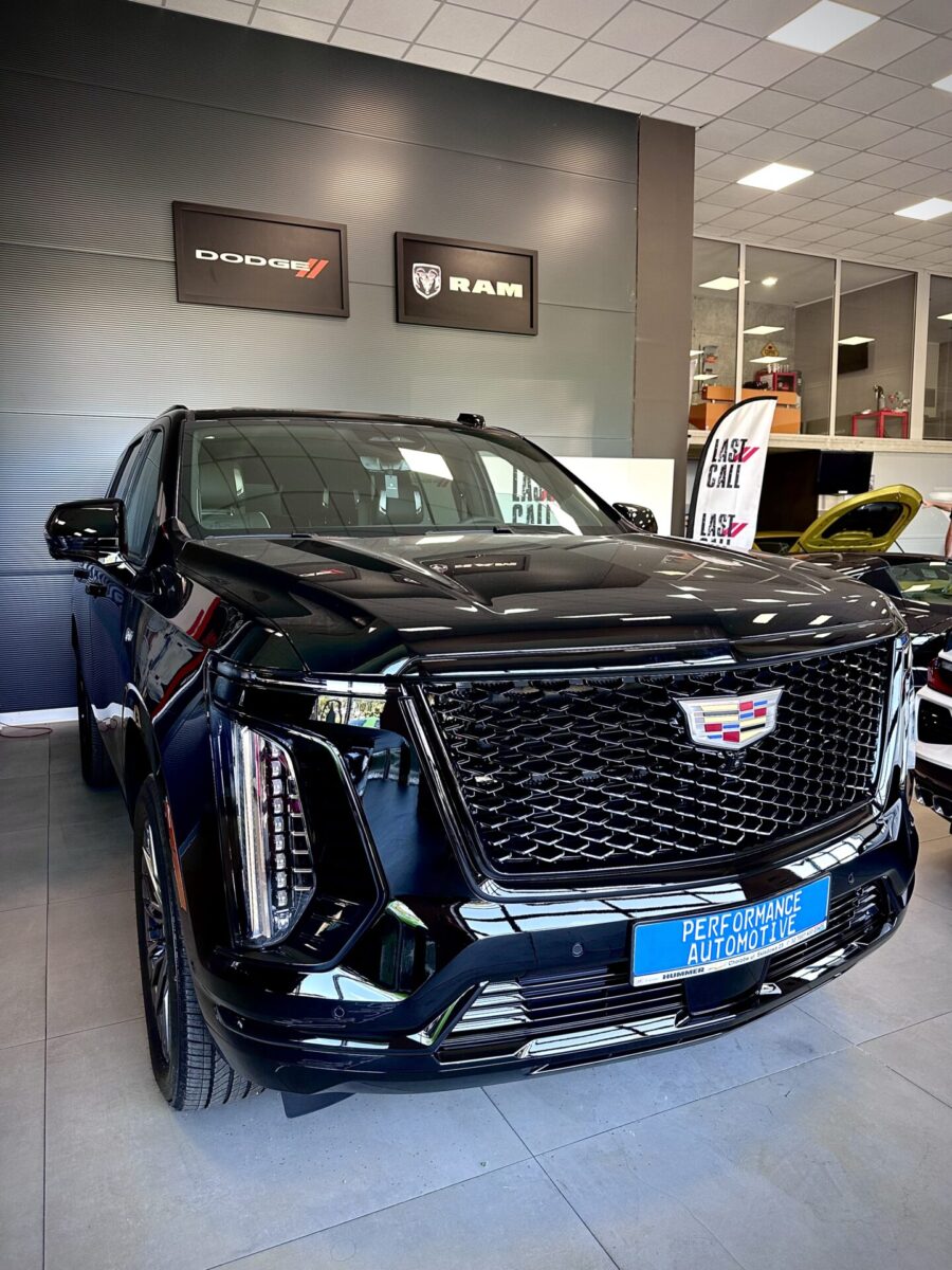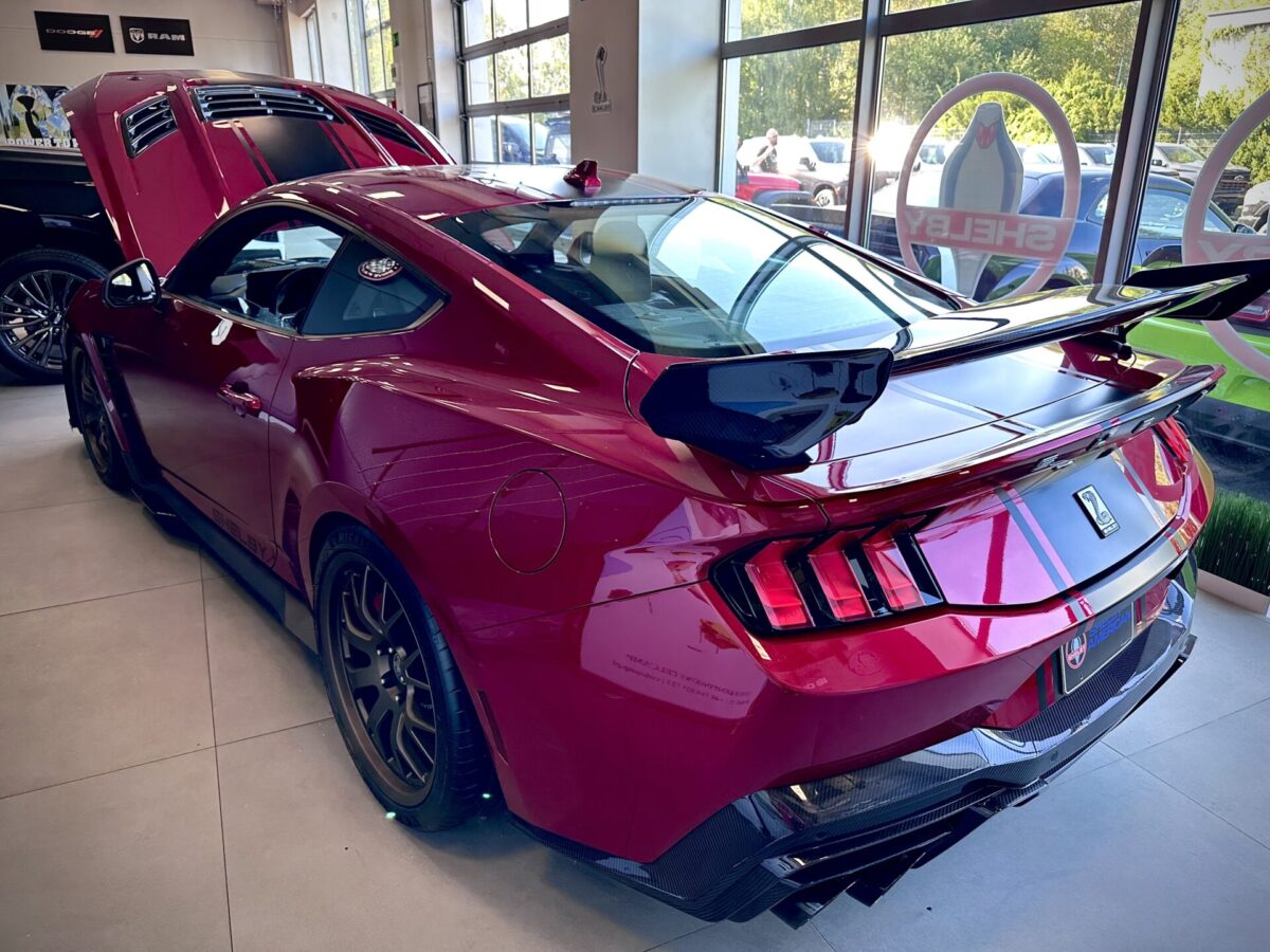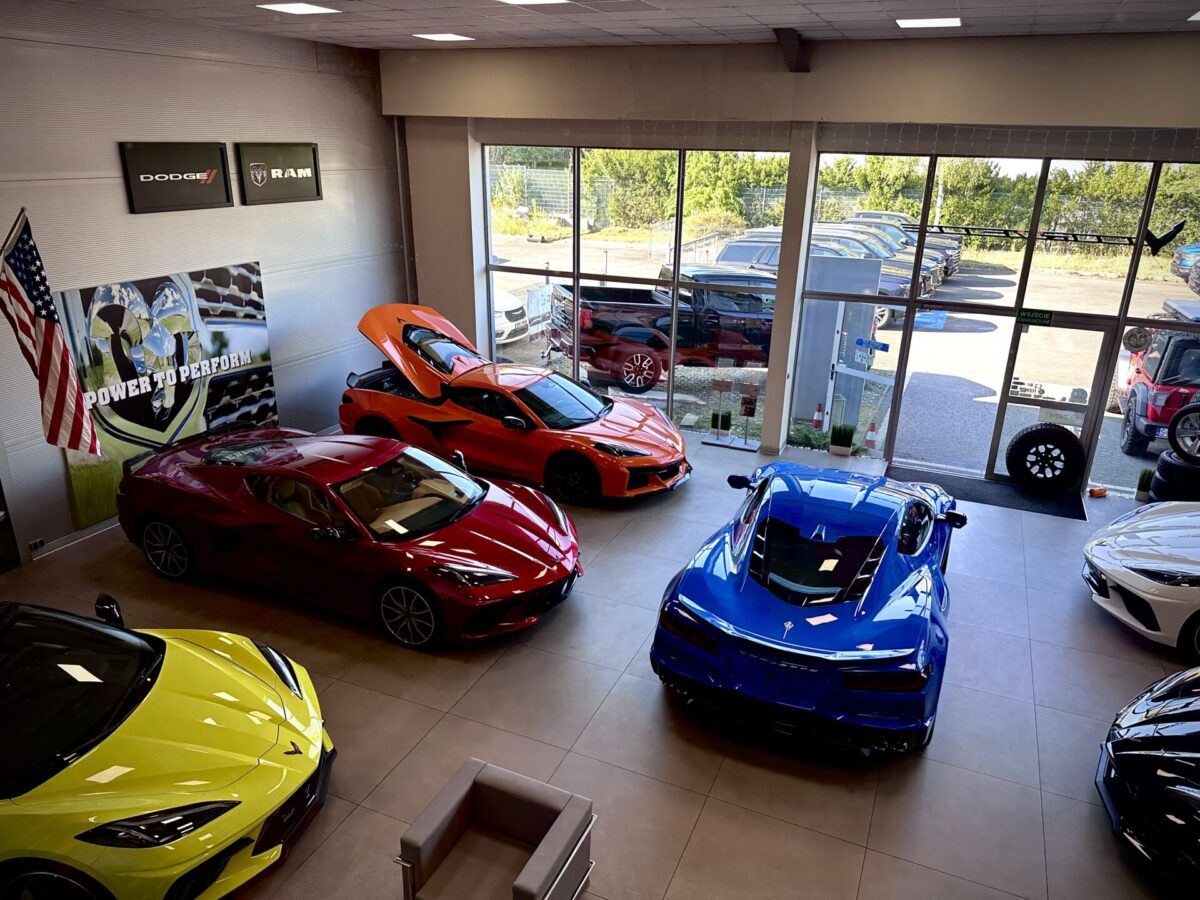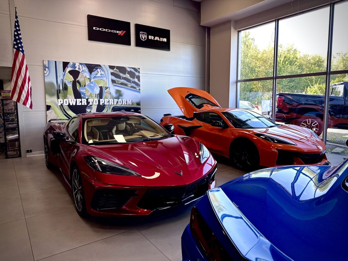 Środek Performance Automotive to niejako przeniesienie do domu Corvetty. Po przekroczeniu progu ukazało się nam 6 (słownie sześć) sztuk Chevroleta Corvetty C8, każda w innym kolorze, i różnych wydaniach. Za centralnie umieszczoną niebieską sztuką E-Ray stało nowiusieńkie złoto-żółte Camaro. Po lewej stronie salonu miejsce zostało przeznaczone dla królów. Czarny Cadillac Escalade ESV 2025 oraz Shelby Super Snake 2024 (S650). W Polsce ciężko spotkać te auta nawet na zlotach. A Tu? Stoi fabrycznie nowe Shelby za ponad bańkę…