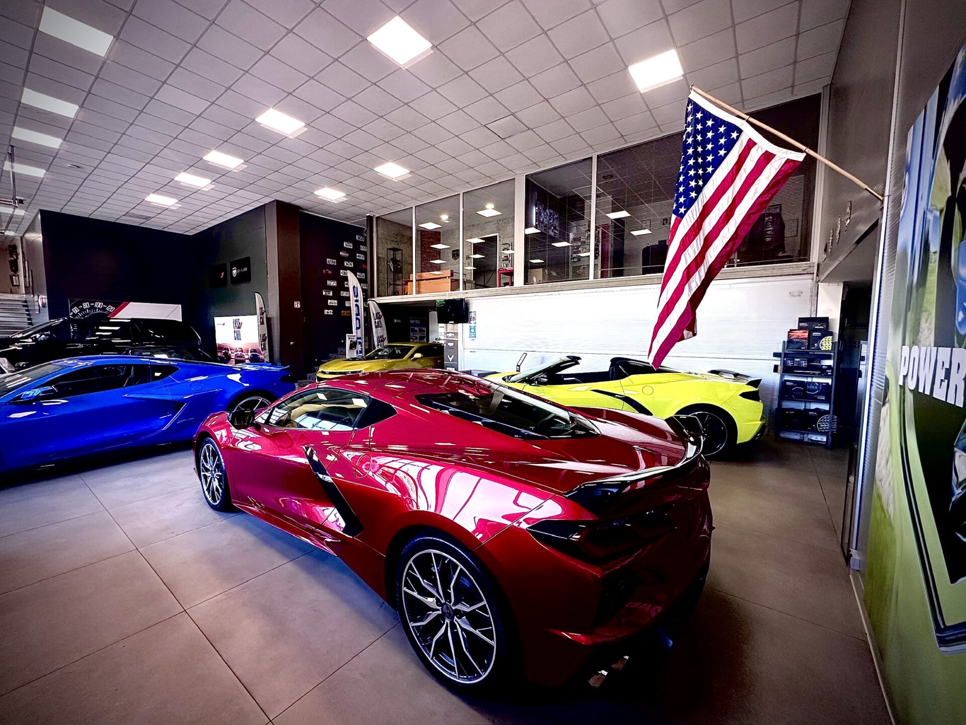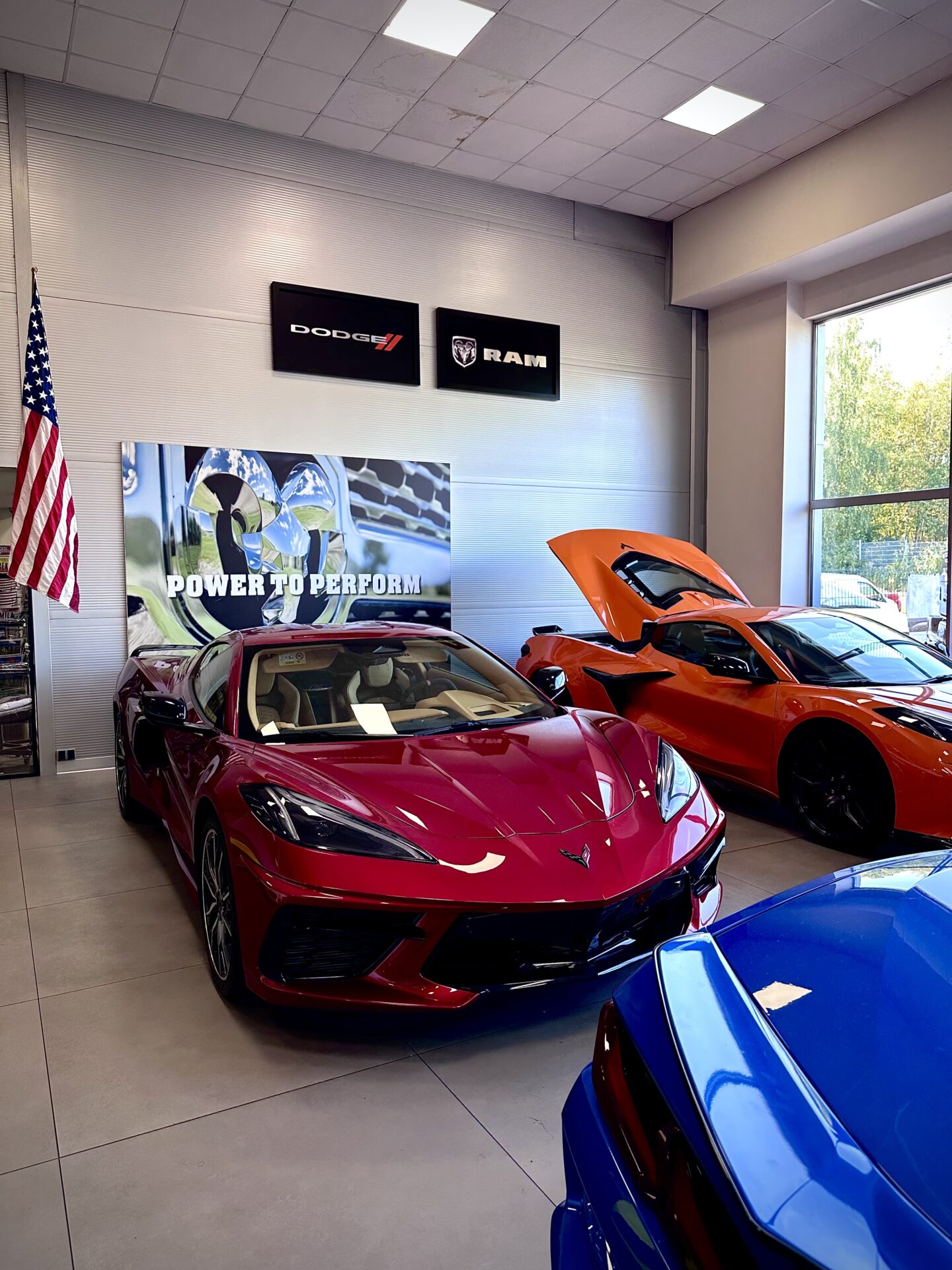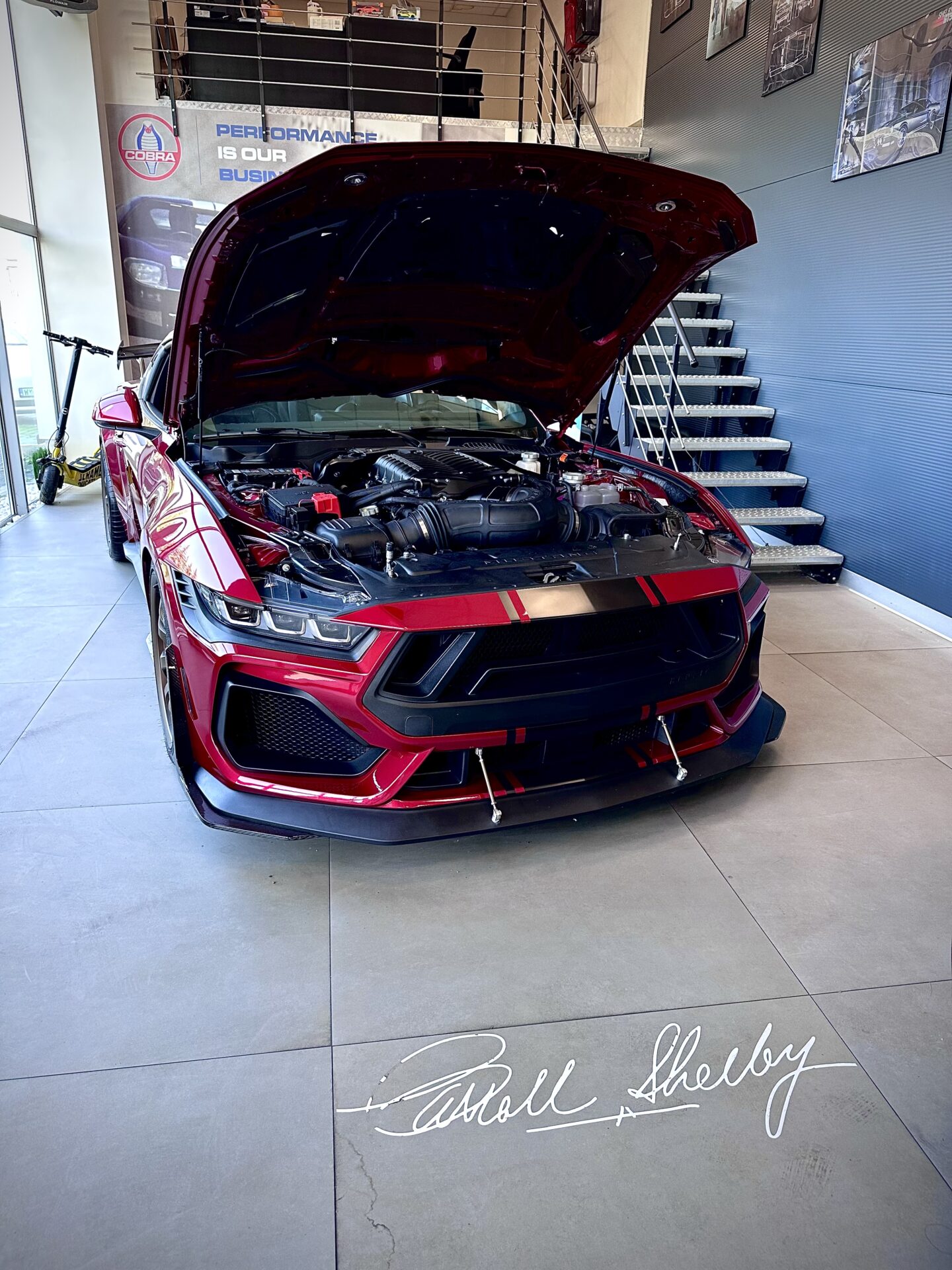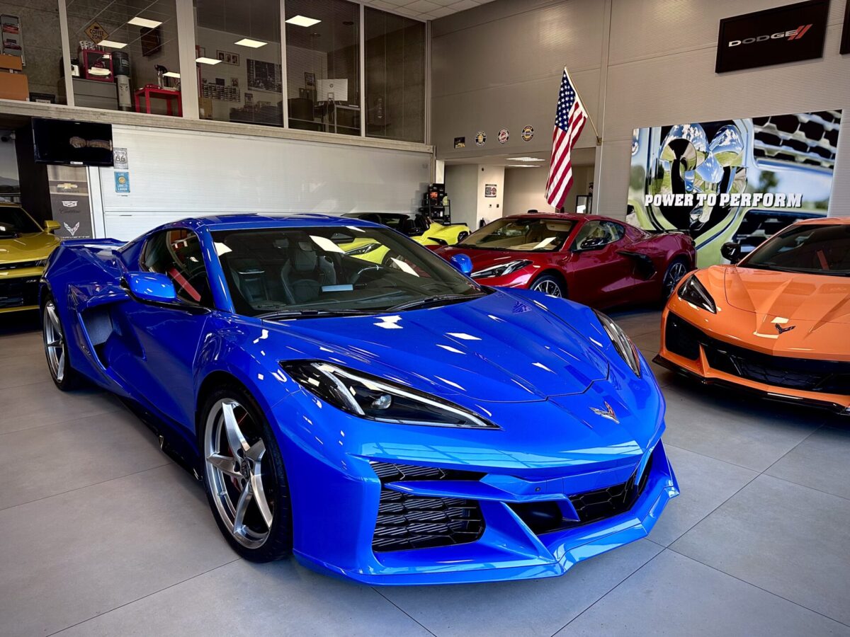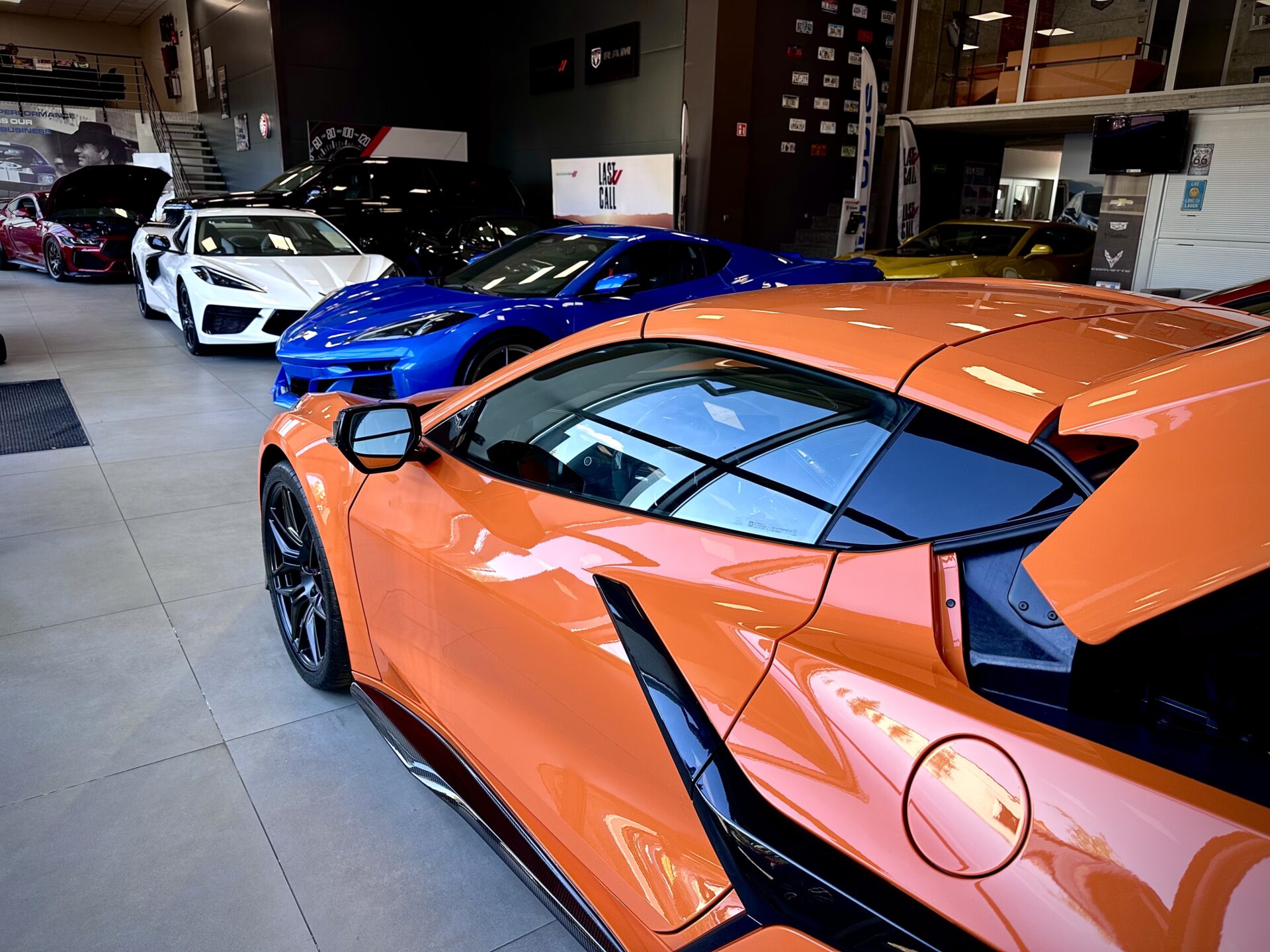 Środek Performance Automotive to niejako przeniesienie do domu Corvetty. Po przekroczeniu progu ukazało się nam 6 (słownie sześć) sztuk Chevroleta Corvetty C8, każda w innym kolorze, i różnych wydaniach. Za centralnie umieszczoną niebieską sztuką E-Ray stało nowiusieńkie złoto-żółte Camaro. Po lewej stronie salonu miejsce zostało przeznaczone dla królów. Czarny Cadillac Escalade ESV 2025 oraz Shelby Super Snake 2024 (S650). W Polsce ciężko spotkać te auta nawet na zlotach. A Tu? Stoi fabrycznie nowe Shelby za ponad bańkę…