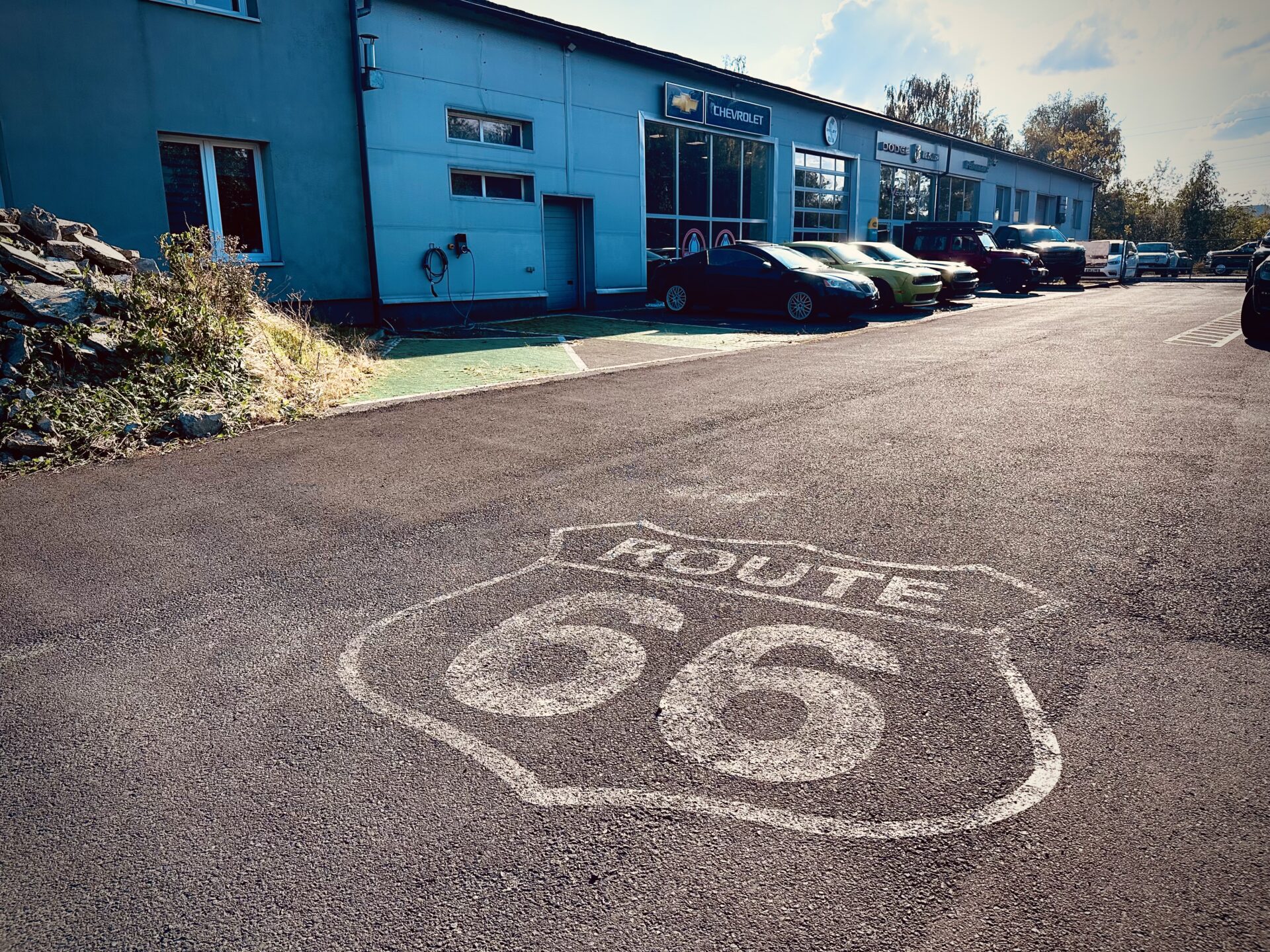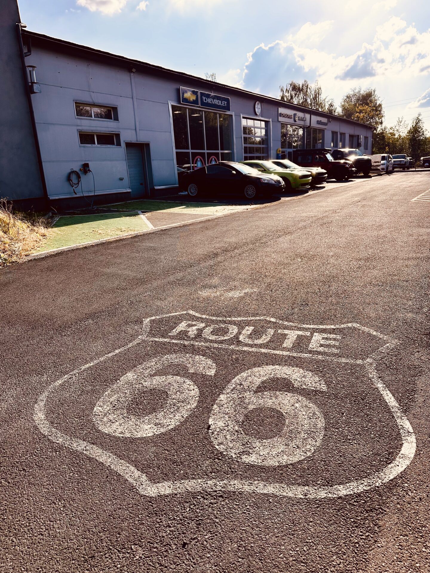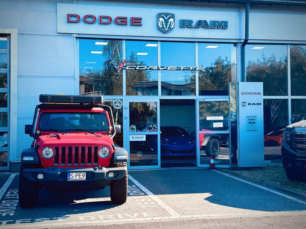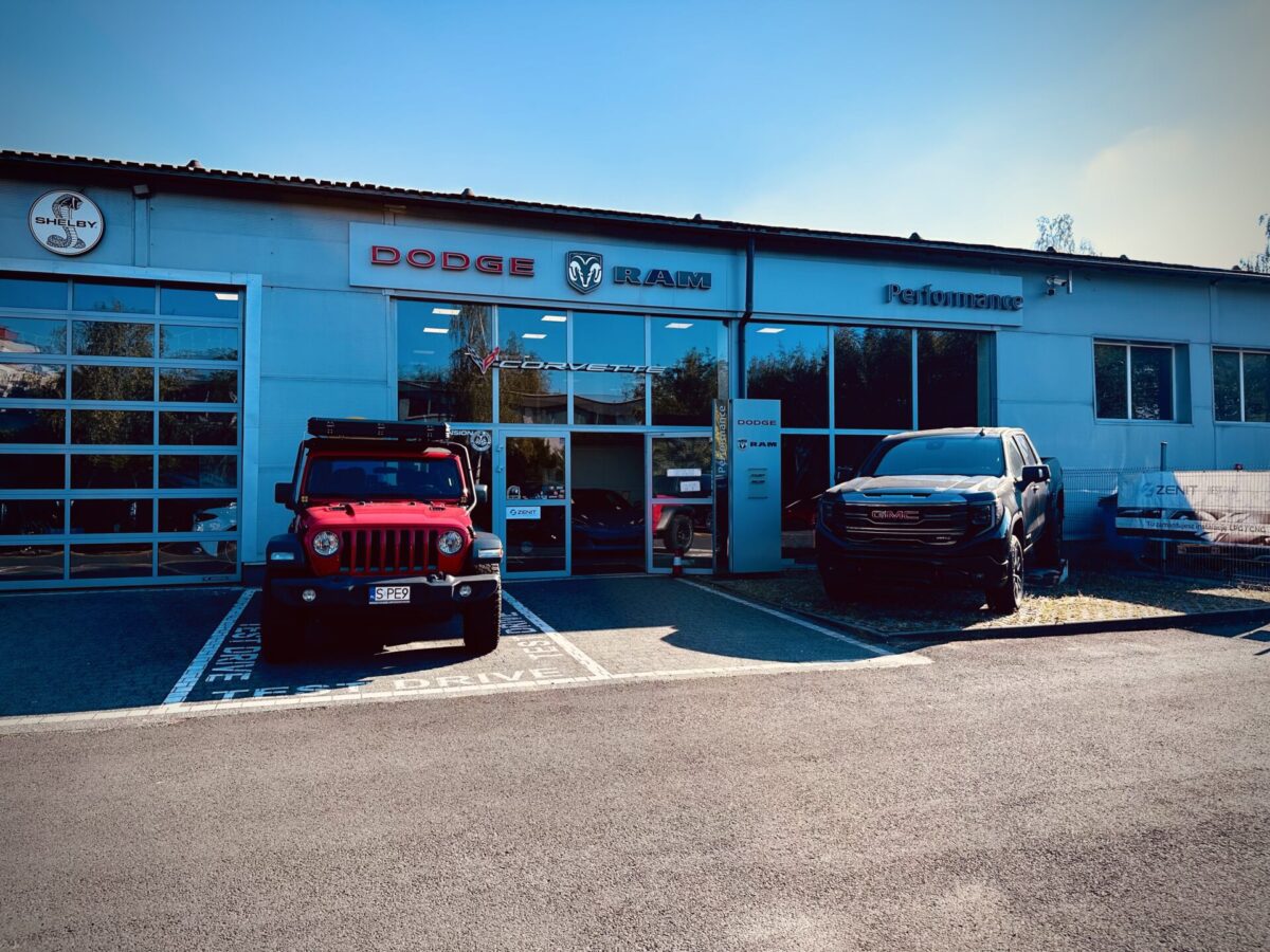 Gdy znaleźliśmy się na ulicy Składowej i nawigacja kazała nam skręcić w bramę po lewej stronie wiedzieliśmy, że trafiliśmy w dobre miejsce. Pierwsze co rzuciło się w oczy to sporej wielkości znak „Route 66” na asfalcie. Drugie to stojące na przodzie Cadillacki a następnie RAM-y. Auta których nie spotyka się w takiej ilości na drodze i zwykłym parkingu. Zewnętrzny parking w sumie wypełniały Cadillacki, Jeepy, RAM-y, Suburban oraz dwa challengery. W tle zaś stało nowe auto reklamowe salonu, laweta Ram 5500 z dwoma Camaro „na barkach”,
