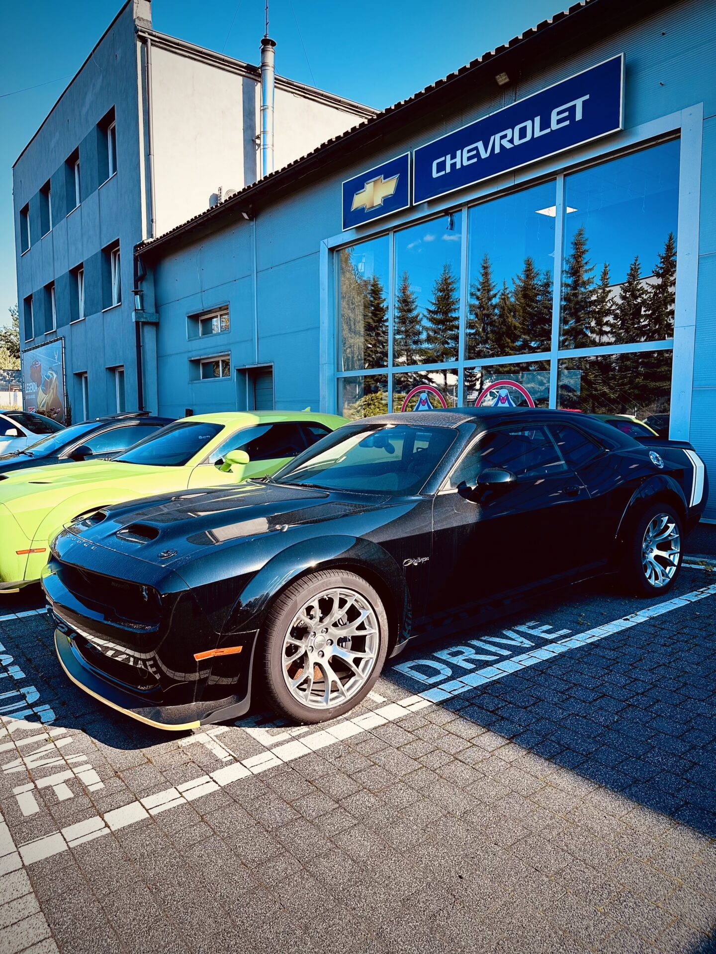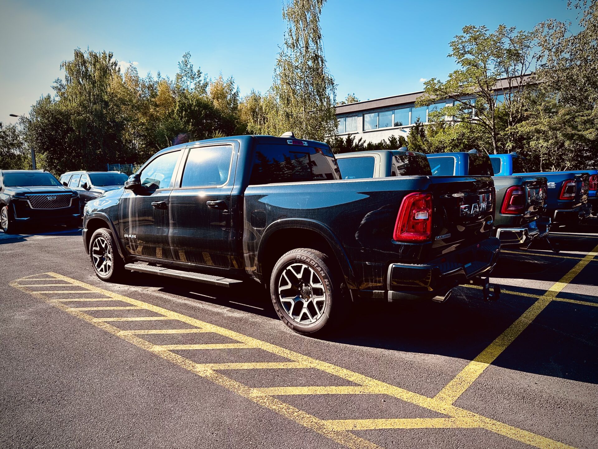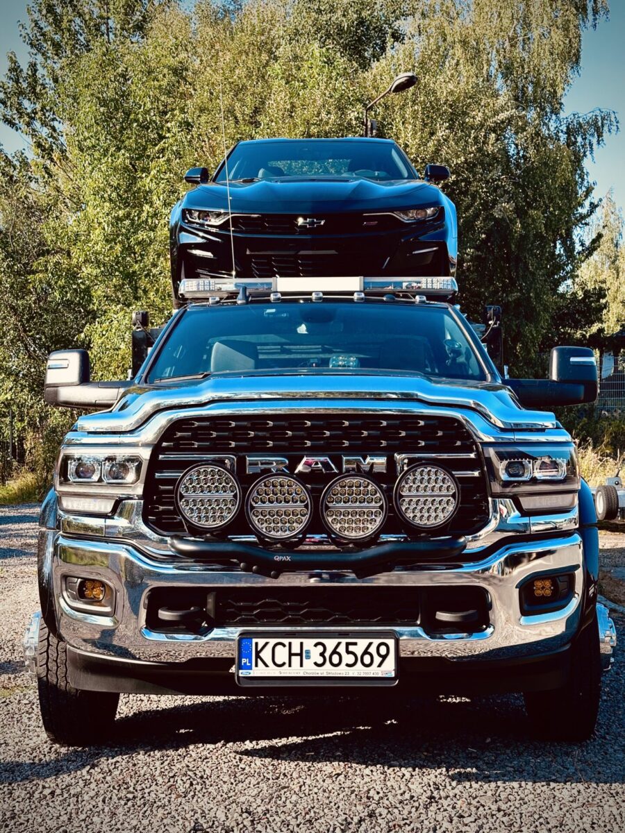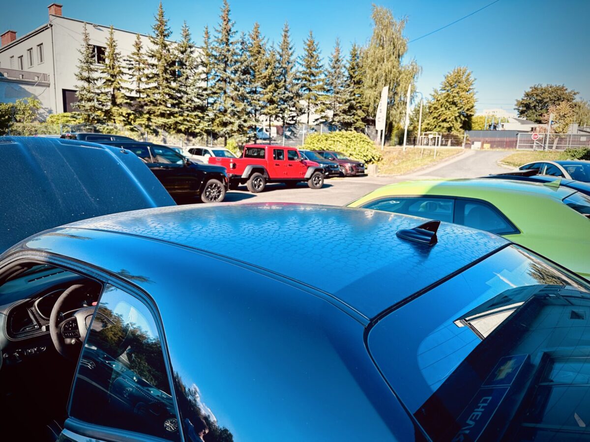 Gdy znaleźliśmy się na ulicy Składowej i nawigacja kazała nam skręcić w bramę po lewej stronie wiedzieliśmy, że trafiliśmy w dobre miejsce. Pierwsze co rzuciło się w oczy to sporej wielkości znak „Route 66” na asfalcie. Drugie to stojące na przodzie Cadillacki a następnie RAM-y. Auta których nie spotyka się w takiej ilości na drodze i zwykłym parkingu. Zewnętrzny parking w sumie wypełniały Cadillacki, Jeepy, RAM-y, Suburban oraz dwa challengery. W tle zaś stało nowe auto reklamowe salonu, laweta Ram 5500 z dwoma Camaro „na barkach”,