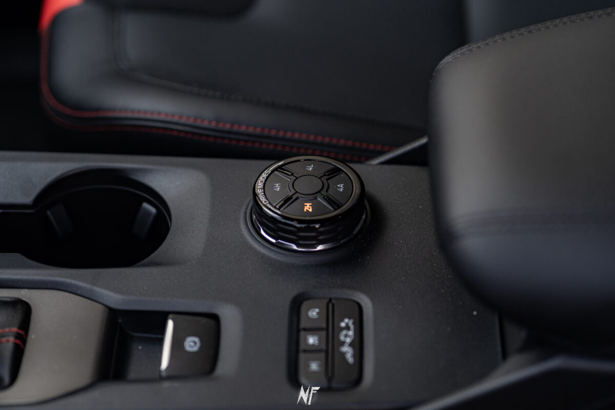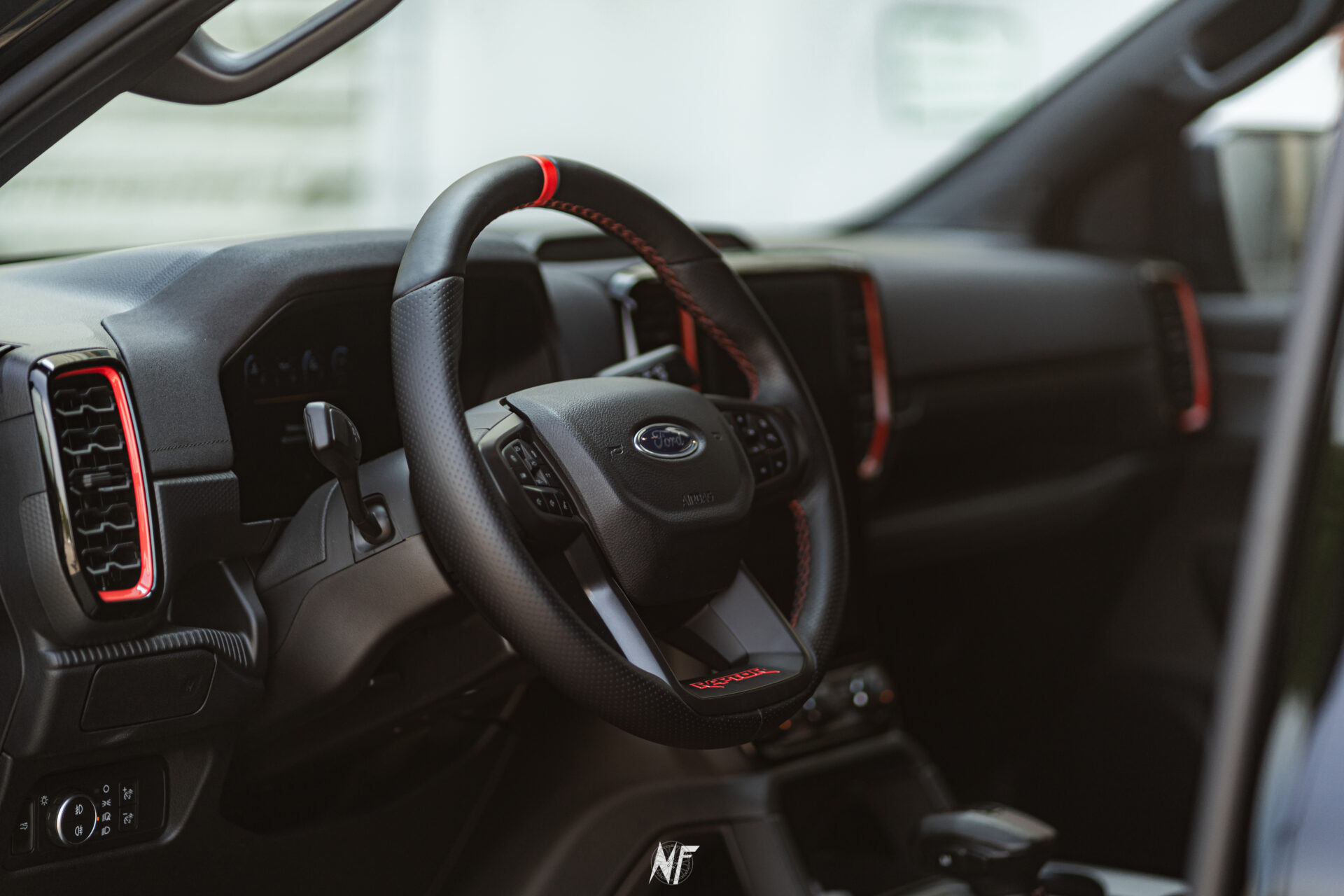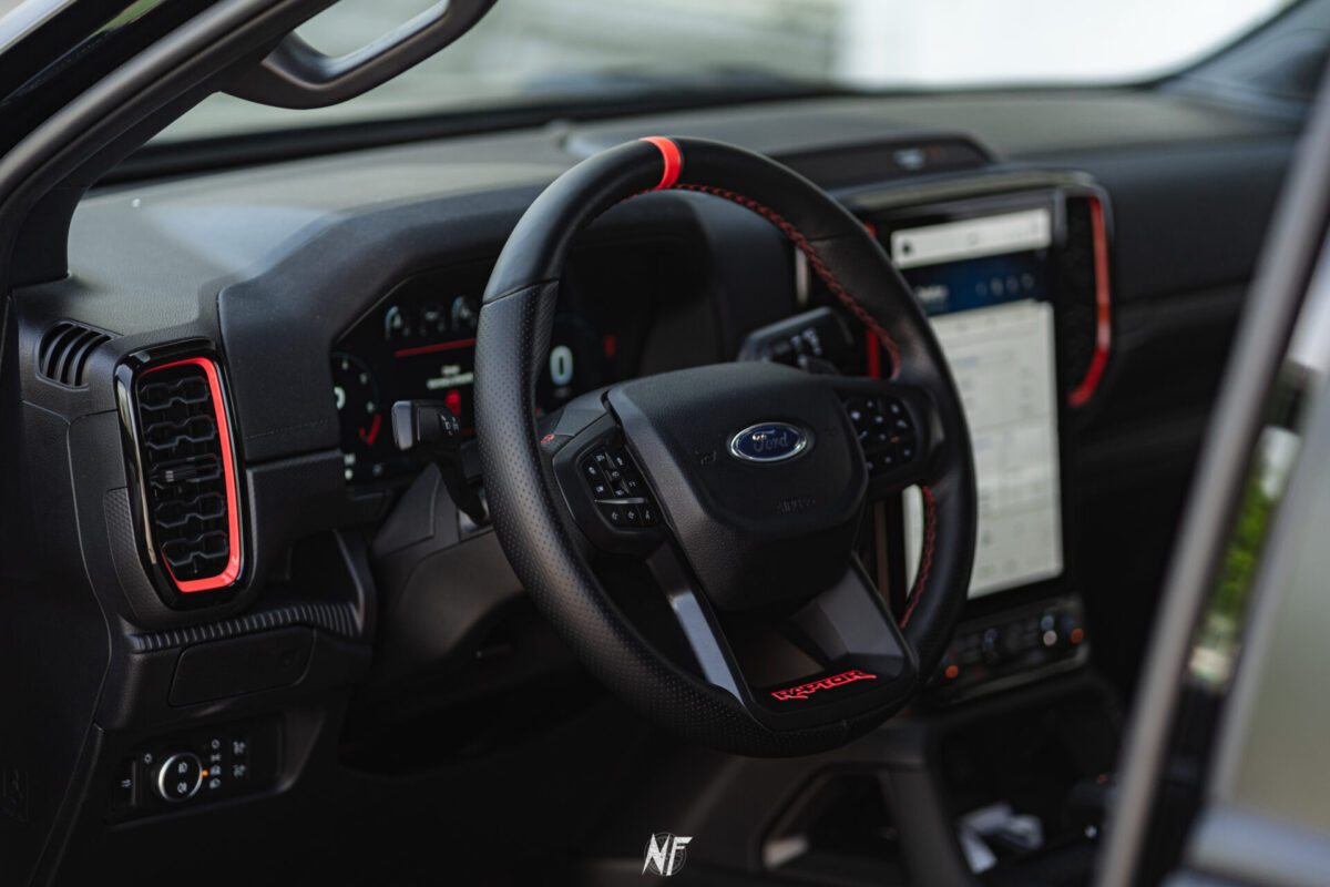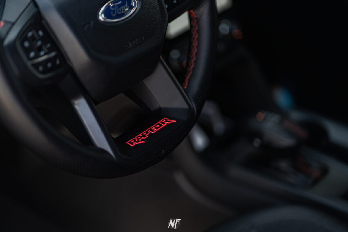 3 litrowy silnik V6, wyczynowe zawieszenie, tryb jazdy Baja a do tego satynowa czerń. To coś, co wyróżnia Raptora. Tych kilka kilometrów między parkingiem a miejscami sesji zdjęciowej miałem okazje poprowadzić Ranger’a. Choć auto małe nie jest, to prowadzi się bardzo lekko. Tak naprawdę do jazdy nie trzeba używać w ogóle siły, co jest trochę zwodnicze. Druga rzecz to bajeczne zawieszenie, bez względu na stan dróg auto jedzie jak po pasie startowym. Wykończenie wnętrza jest na bardzo wysokim poziomie, do tego czarne wnętrze z czerwonym wykończeniem nadaje Fordowi pazura.