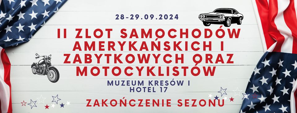 Serdecznie zapraszamy na II ZLOT SAMOCHODÓW AMERYKAŃSKICH I ZABYTKOWYCH ORAZ MOTOCYKLISTÓW na zakończenie sezonu, który odbędzie się w dniach 28-29 września 2024 roku.